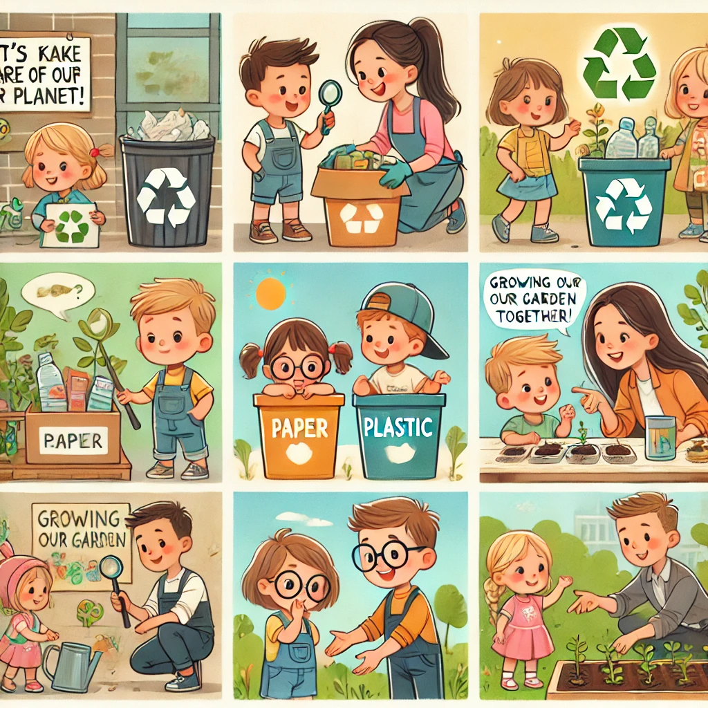 • Storytelling and Books on Sustainability: Using books and stories that teach environmental themes, like protecting animals and conserving resources, to foster a love for nature and eco-consciousness.